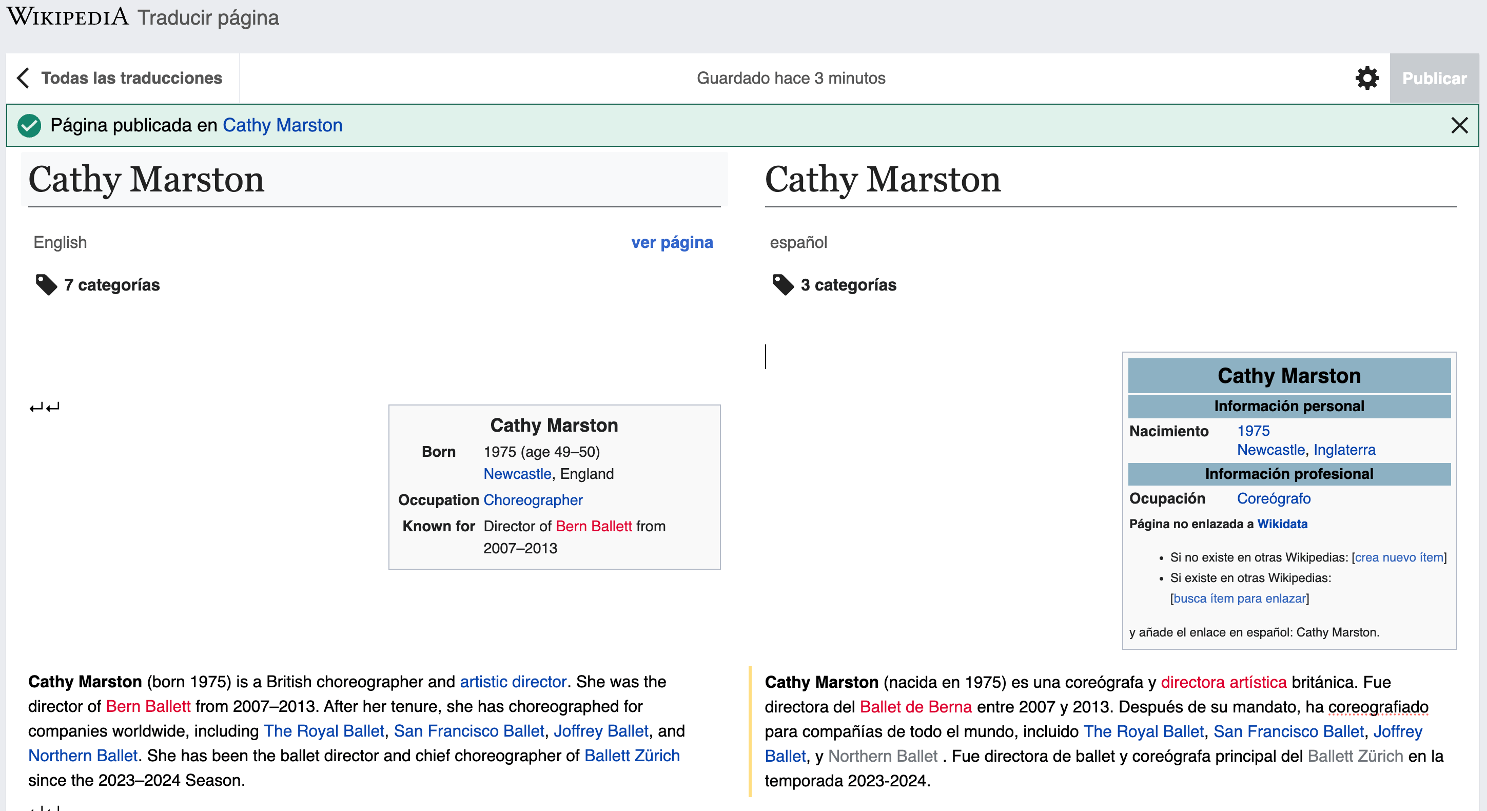 This project feeds into something larger: imagining how public data and open platforms can inspire new, data-driven research in the arts, especially in historically overlooked communities. I found that there is still much to do to fill the gap of female dancers in Wikipedia. Pages for dancers and choreographers like Isabella Boylston, Devon Teuscher, Pippa Moore, Ruthanna Boris, and Gillian Lynne are still underrepresented in Spanish and other languages. Moreover, contributing to Wikipedia public knowledge also strengthens my continuous work with the Dance Data Project, which is committed to improving the representation of women in dance leadership. There is so much potential in aligning cultural scholarship with accessible, collaborative tools!!